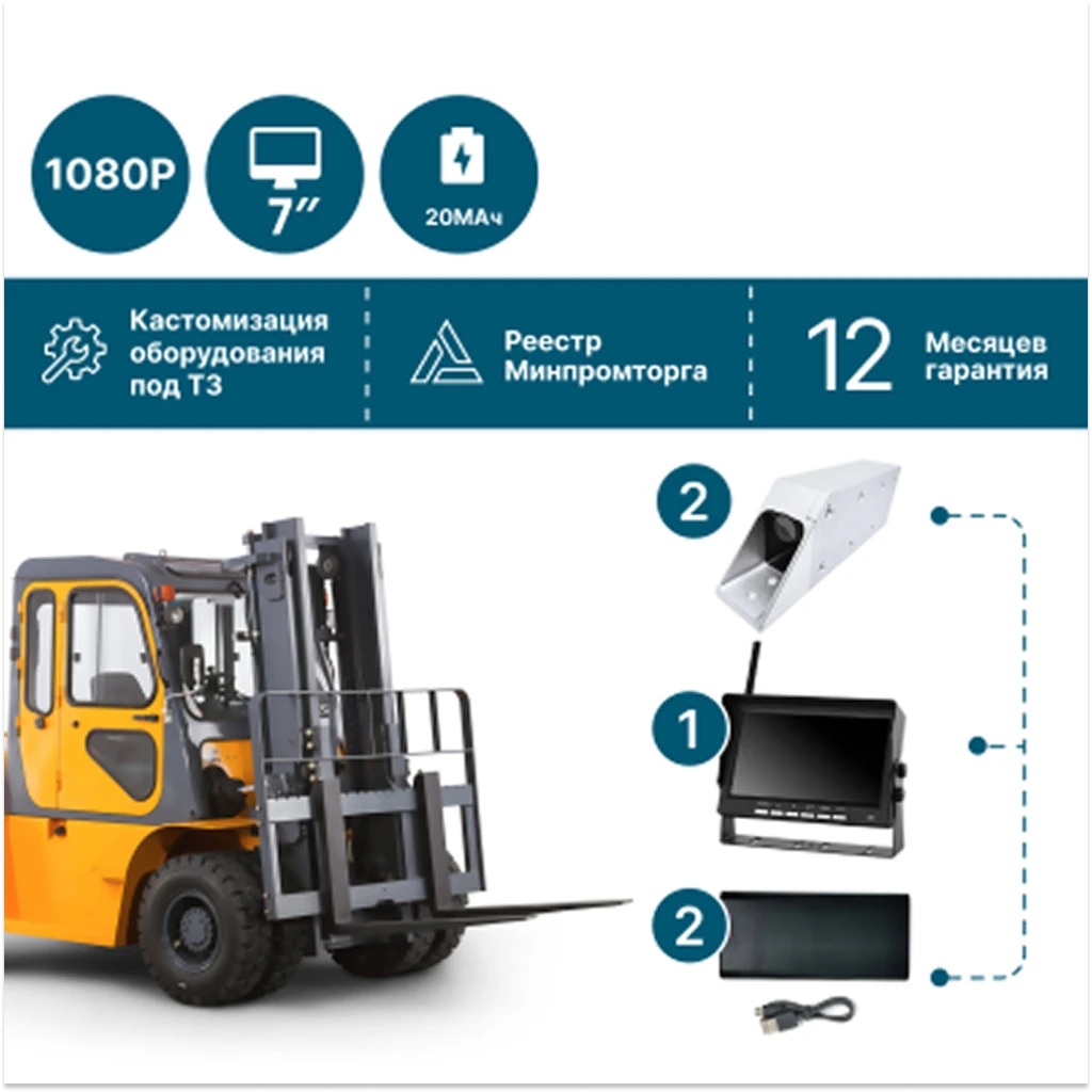Беспроводной комплект NSCAR РК204 с 2 камерами для вилочных погрузчиков. Контроль погрузки, ударопрочный корпус, питание от пауэрбанка.